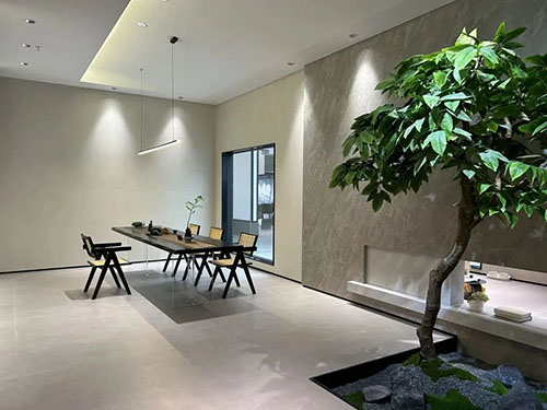 全新展廳本著“打破界限,沒有界限”的設計理念,本案設計師將一個以家為命名的陶瓷展廳,打造成一個自由開放的大平層和別墅生活的復合體。拾取中式園林和現代家居之根本,開創全新當代豪宅生活的空間范例。