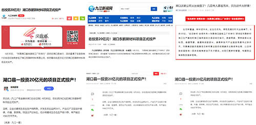 東鵬湖口基地作為湖口當地綠色經濟發展的重大項目,“生態新材 創領未來—東鵬湖口超級工廠環保行”活動一經發布,便吸引當地主流媒體九江新聞網、九江視聽網、湖口熱線、湖口發布、商務九江、湖口流泗熱線、鳳凰江西等爭相報道,活動受到了湖口熱線的高度關注和大力支持,全程直播報道。
