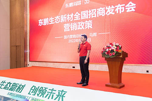 東鵬生態新材事業部國內營銷總經理馬暉對本次活動的營銷政策進行了講解,主要從東鵬新材招商政策、合作模式、盈利模式、政策支持等方面展開,從投入和產出為客商做了詳盡藍圖規劃,招商優惠力度之大前所未有。