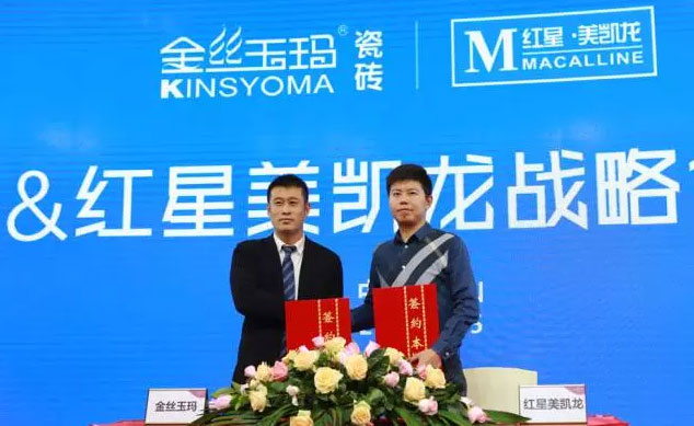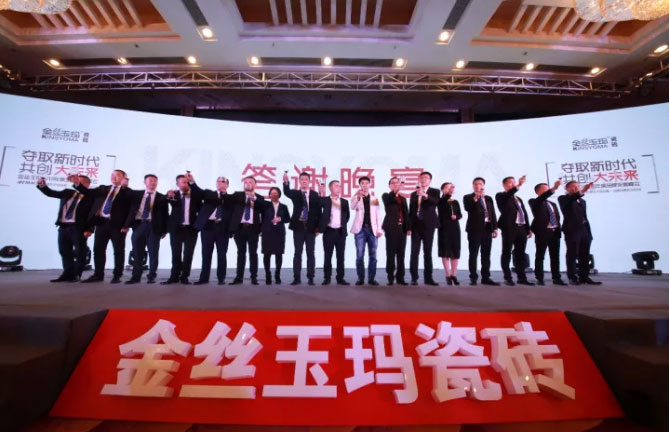 會議中,金絲玉瑪瓷磚還與紅星美凱龍舉行了戰略伙伴簽約儀式,并且成立了分公司。作為全國地標性家居巨頭,紅星美凱龍是目前最優質的商場,此次簽約,以高端品牌為定位的金絲玉瑪能借力整合更多規模優勢、數據優勢和經營優勢,兩者強強聯手,互惠共贏,共舉高端家居發展大旗!成立了分公司后,總部為分公司客戶劃分更大區域市場,給予更多資源支持,使其快速達成多網點布局,多渠道開拓,從而實現廠商一體,紅利共享。