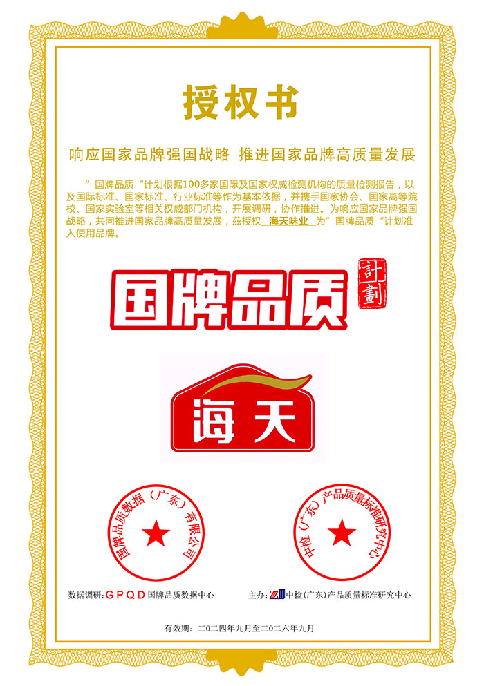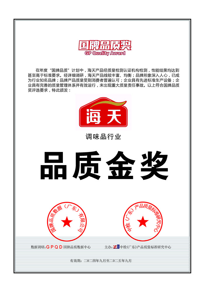 海天創立于清朝乾隆年間,已有三百多年的歷史,其產品在國內外市場上享有很高的知名度和美譽度,也是中華人民共和國商務部公布的首批“中華老字號”企業之一。目前生產的產品涵蓋醬油、蠔油、醬、醋、料酒、調味汁、雞精、雞粉、腐乳、火鍋底料等十幾大系列百余品種近1000規格,年產值過兩百億元。海天一直堅持選用優質原料,采用先進的生產工藝和嚴格的質量控制體系,確保產品的品質穩定和安全可靠。斬獲“國牌品質金獎”,實至名歸。
