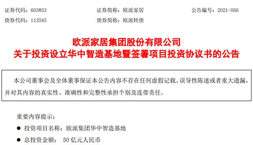 | 7月8日,歐派家居(603833.SH)發布公告,為滿足公司未來經營發展的需要,歐派家居集團股份有限公司與武漢市蔡甸區人民政府今日簽署了《項目投資協議書》。公司擬在武漢市蔡甸區投資建設“歐派集團華中智造基地”,項目總投資50億元人民幣,資金來源為公司自籌。 從公告獲悉,本協議簽訂后壹個月內,公司在武漢市蔡甸區人民政府屬地注冊成立全資法人公司作為項目公司,項目總注冊資本金不低于 5 億元人民幣。 ![]() 本項目所取得工業用地分為三次供地,項目進行分期建設,自第一次供地的《國有建設用地使用權成交確認書》簽訂之日起,一期項目 3 個月內實質性開工建設,建筑面積不低于 30 萬㎡;二期項目于一期項目投產后 6 個月內實質性開工建設,每一期項目正式開工后 24 個月內建成。自項目實質性開工建設之日兩年內,確保項目建成或在建面積不低于總規劃面積的 50%。 在現有的南方(清遠、廣州)、天津、無錫、成都四大基地基礎的上,歐派家居本次投資設立“歐派集團華中智造基地”,新增的產能規劃將滿足未來公司訂單規模增長的需要,完成生產基地東南西北中的戰略布局。本項目投產后,歐派家居能更加及時、有效地滿足未來全國主要區域銷售市場的訂單需求,減少長距離的物流運輸成本和降低產品運損率的發生,提高公司產品的價格競爭力和客戶滿意度,進一步提升公司的核心競爭力。