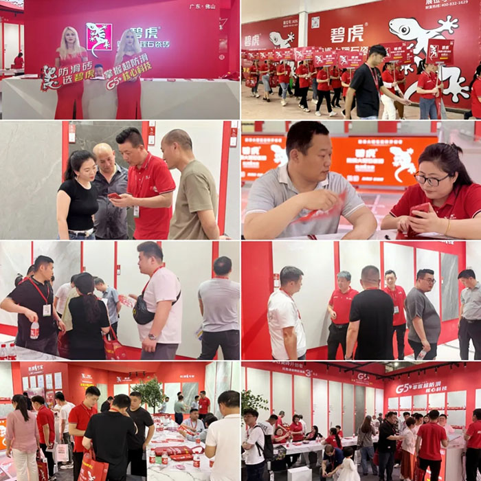 憑借過硬的品牌實力,碧虎一舉包攬了各大主流出入口廣告,數十個小蜜蜂成為展館全天流動廣告、展臺現場中外模特走秀爭艷......碧虎紅充斥整個展館,碧虎防滑大理石瓷磚成為各大客商爭相打卡、爭相體驗、爭相合作的焦點!