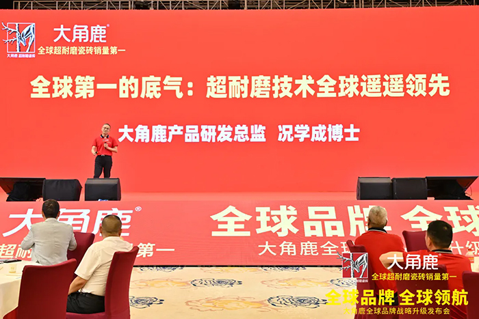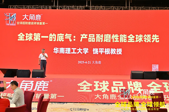 華南理工大學饒平根教授詳細解析了大角鹿超耐磨瓷磚技術優勢,并介紹了品牌最新研發的“耐磨王”瓷磚。這款挑戰全球最高標準的6000轉極限耐磨瓷磚,耐磨性能遠超行業標準,堪稱全球耐磨瓷磚的“王者”。這款新產品由大角鹿聯合華南理工大學材料學院歷經2年共同研發,獨創第四代藍寶石晶體超耐磨鉆石釉工藝技術,該技術已獲國家發明專利,在陶瓷材料科學領域斷層領先,使瓷磚耐磨性能至少領先同行3-5年。