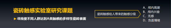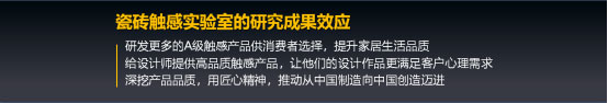 通過四大專業研究方法,完成“尋找使不同人群達到A類觸感的多樣性瓷磚表面”的研究課題,產生“研發更多的A級觸感產品供消費者選擇,提升家居生活品質;給設計師提供高品質觸感產品,讓他們的設計作品更滿足客戶內心需求;深挖產品品質,用匠心精神,推動從中國制造向中國創造邁進”的成果效應。