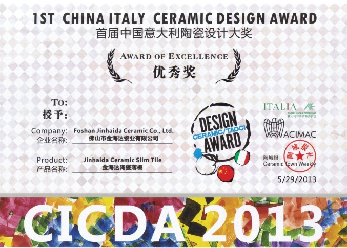 2013年5月29日,在佛山新媒體產業園首屆“意大利陶瓷設計大賽”頒獎禮現場,金海達薄板憑借“北歐楓情”系列產品作為薄板界唯一代表榮獲設計大獎。此次獎項的評比,完全嚴格參照意大利的相關標準,對參選公司的技術水平、設計實力進行客觀公正嚴謹地考評,旨在選出設計概念與產品品質最杰出的瓷磚產品。