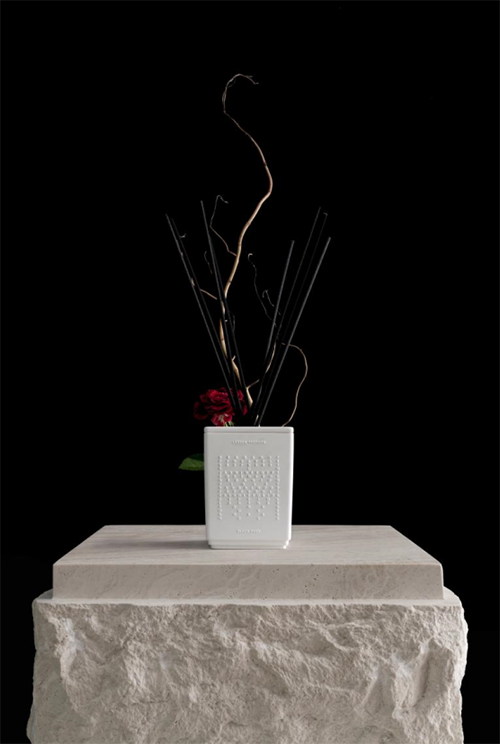 延續香料表字母的排版設計,在純白的石膏杯上做了凸起,看起來有點像“盲文”,也像是解謎香氛的神秘暗語。
