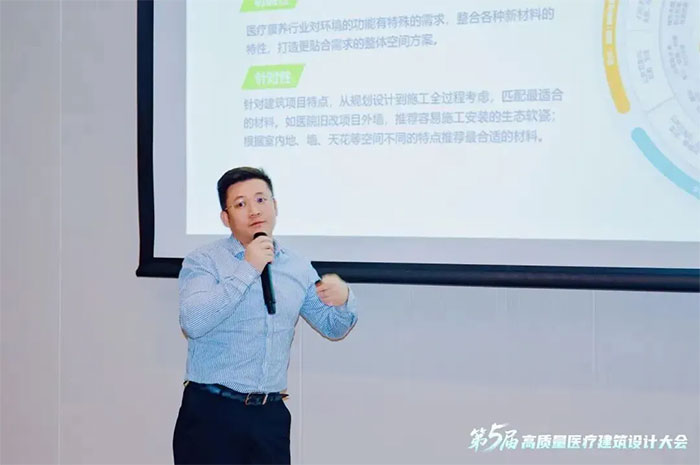 廣東新明珠綠材科技有限公司總經理陳梓德分享了《綠建飾材,助力美好醫院建設》的主題演講,介紹了綠色建筑材料在現代醫院建設中的應用價值與發展前景。