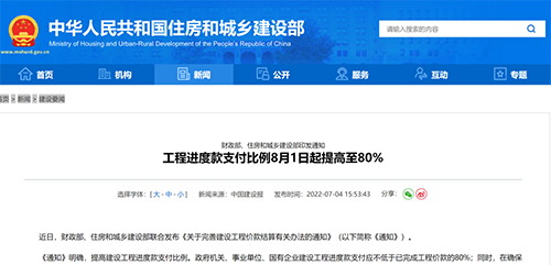 財政部、住建部發布《關于完善建設工程價款結算有關辦法的通知》,通知明確:8月1日起,提高建設工程進度款支付比例,政府機關、事業單位、國有企業建設工程進度款支付應不低于已完成工程價款的80%;當年開工、當年不能竣工的新開工項目可以推行過程結算。