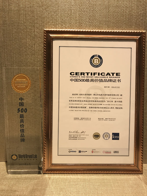 2017年“500最具價值品牌”,由諾貝爾經濟學獎得主羅伯特·蒙代爾教授(Robert Mundell)任主席的世界品牌實驗室(World Brand Lab),基于財務、消費者行為和品牌強度等方面進行分析后得出,極具參考價值及行業地位。名典磁磚在去年入榜后,品牌全面發力,今年繼續蟬聯,以60.98億元繼續捍衛“500最具價值品牌”地位。