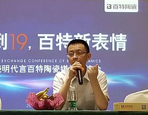 4月15日,百特陶瓷成功牽手影視巨星黃曉明先生為品牌形象代言人,消息引發了行業內的普遍關注。4月28日,百特陶瓷特在佛山南莊華夏陶瓷城順成企業百特陶瓷四樓會議室活動特意舉辦了以“從19到19 ,百特新表情”的黃曉明代言百特陶瓷媒體交流會,與三十多家行業和大眾媒體一起,溝通交流本次簽約活動背后的品牌故事和營銷理念。百特陶瓷品牌銷售總經理周于中出席了本次媒體交流會,三十多家媒體代表出席了本次活動。