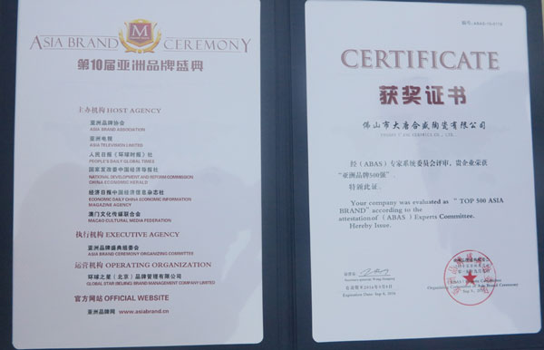 9月8日至10日,由亞洲品牌協會聯合亞洲電視、人民日報《環球時報》社、發展改革委經濟導報社、經濟日報經濟信息雜志社和澳門文化傳媒聯合會共同主辦的第10屆亞洲品牌盛典在澳門威尼斯人度假村酒店隆重舉行。大唐合盛瓷磚在數于百計的品牌中脫穎而出,再度上榜亞洲品牌500強。迄今為止大唐合盛瓷磚已連續三年榮登“亞洲品牌500強”榜單,再一次體現了大唐合盛瓷磚經過十一年的高速發展所形成的品牌價值魅力,以及在行業中的標桿地位。