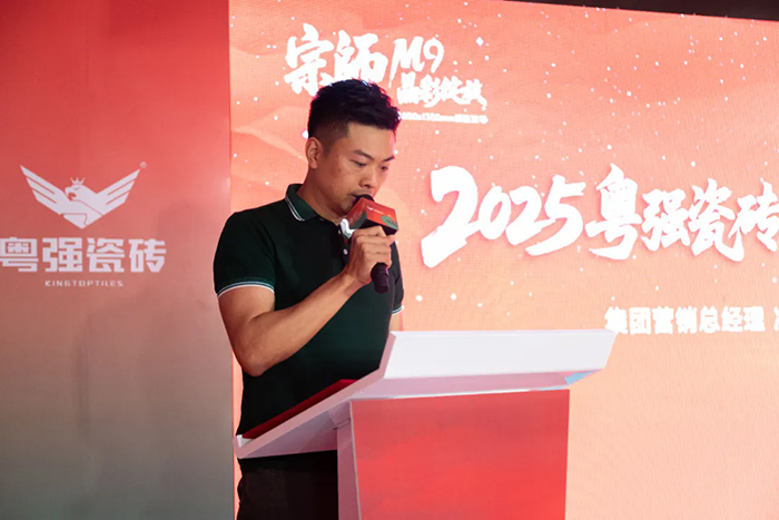 4月28日,“宗師M9·晶彩綻放”——粵強宗師M9七彩結晶800*1350mm新品發布會在佛山盛大召開!集團董事長梁其、公司董事長梁勝遠、集團總經理羅昶、集團營銷總經理冼建堂、集團戰略部總經理梁浩堂、集團經理梁浩全、集團市場中心總經理冼桐華、粵強品牌總經理謝訪林、粵強品牌常務副總經理吳惠東、集團市場中心經理顏偉生、集團設計中心總監夏明星、集團產品研發主管袁紅建等高層領導,與全國經銷商摯友、行業媒體精英共聚一堂,以戰略升維、產品破界、終端賦能三大維度,擘畫2025粵強品牌發展新藍圖,開啟高端瓷磚市場新紀元。