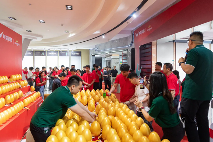 隨后,粵強品牌常務副總經理吳惠東登臺,公布了一系列令人心動的優惠訂購政策,將大會氛圍推向了最高潮,經銷商們紛紛踴躍下單,現場熱浪翻涌,最終創下13.5萬箱的輝煌戰績。