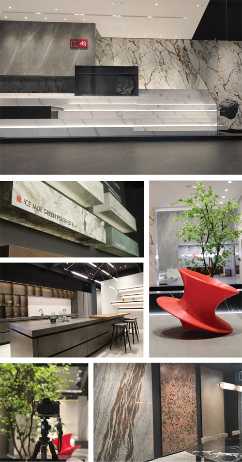 展廳從建筑構架到空間設計、室內軟裝、產品應用展示及氛圍的渲染中,融合東方美學意境、西方簡約風尚和建筑工業等多種文化潮流元素。目的在于強調人與自然的融合,讓巖板以自然和諧的方式融入空間、家居、建筑中,并為消費者提供更多符合中國當代新銳先鋒的生活方式。此次順輝巖板展廳的建成為中國巖板在國際建材家居市場上的創新路和跨界領域的應用奠定了堅實的基礎。