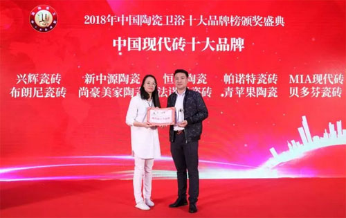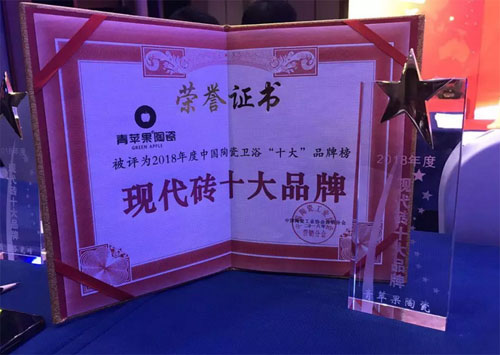 青蘋果陶瓷在經過媒體界,學術界、經濟界的專家、學者以及廣大消費者的數月嚴苛評審,和激烈競爭角逐下,最終憑借卓越的品牌潛力,良好的市場口碑和產品創造力,一舉攬下2018年度陶瓷衛浴十大品牌榜的“現代磚十大品牌”稱號。