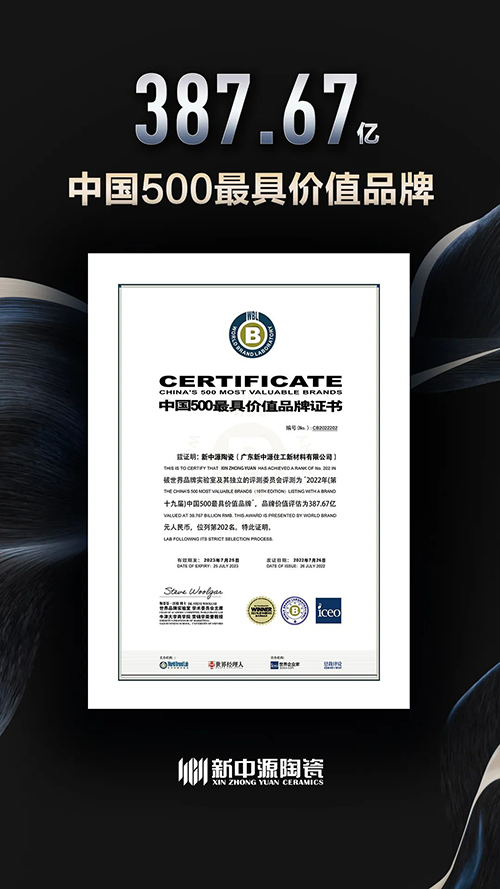 新中源陶瓷以387.67億元的品牌價值,榮登中國500最具價值品牌榜單第202位,連續十七年上榜!