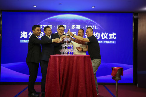 廣東歐文萊陶瓷有限公司董事長梁偉鴻、佛山市繆斯陶瓷有限公司CEO何勇、廣東多慕建材有限公司董事伍源鐸、馬來西亞MML公司COO楊鐵錚、CNA董事長蘇偉濤進行開香檳儀式,預祝此次海外合作項目圓滿成功。