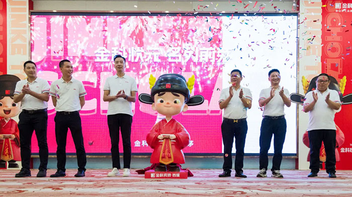 2024年6月18日,金科品牌公司高層領導齊聚一堂,共同為新IP「金科狀元」揭幕。隨著幕布緩緩揭開,「金科狀元」這一充滿活力和創新精神的卡通形象躍然眼前。它身穿采用粵繡而成的狀元袍、頭戴寓意“大賣”的稻棵冠翅造型的冠帽,既體現了金科瓷磚緊跟時代潮流的創新精神,也象征著品牌對于傳統文化的尊重與傳承。