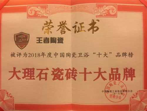 3月27日,在陶瓷工業協會營銷分會主辦,陶瓷品牌網、華南裝修大學共同承辦的2018年度陶瓷衛浴十大品牌榜頒獎盛典上,王者陶瓷憑借其在產品品質、品牌實力、品牌知名度、市場影響力等方面的綜合能力,獲得“陶瓷十大品牌”、“大理石瓷磚十大品牌”兩大殊榮。