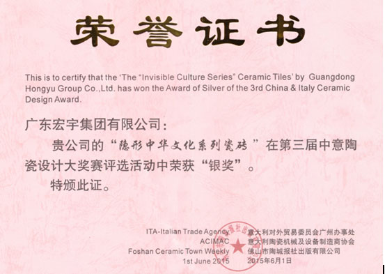 宏宇“隱形中華文化系列瓷磚”榮獲第三屆中意陶瓷設計大賽銀獎證書