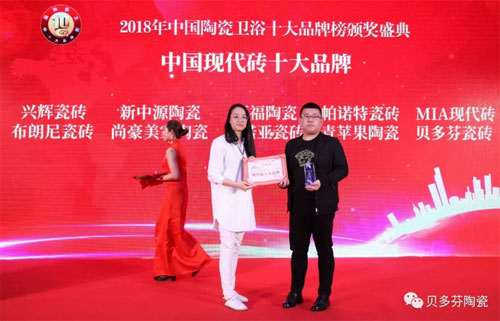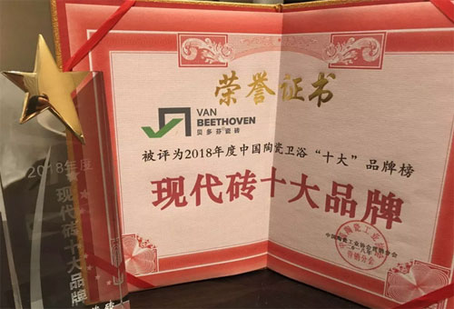 貝多芬陶瓷憑借眾多突破性成長及多年品牌積淀,一舉奪得2018年度現代磚十大品牌榮譽證書,充分證明貝多芬陶瓷為人們所認可的強大實力品牌。