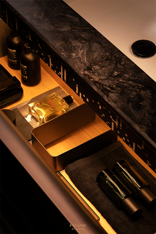 兩側燈光以反射方式映入整體鋁型材抽屜 鋁的質感反光形成舒適氣氛 在暖光燈光的推動下 肌理/材質/色彩交織出的寧靜美感悄然流露