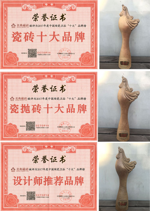 導讀:品牌是一個企業的靈魂,優秀品牌的價值更是企業最重要的無形資產。名典品牌憑借強大的產品實力及良好的品牌優勢,從眾多企業和品牌中脫穎而出,一舉囊括了“瓷磚十大品牌”、“瓷拋磚十大品牌”“設計師推薦品牌”三個極具價值的獎項。