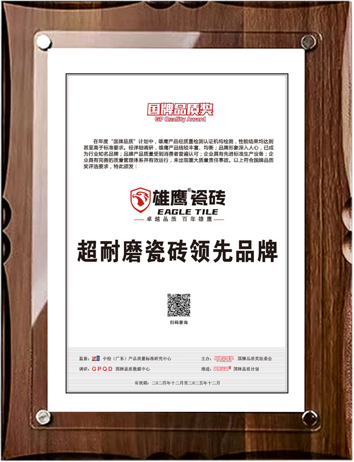 作為“國牌品質計劃”重要組成部分的“國牌品質獎”,是行業公認的品質權威大獎,專業度和權威性備受消費者和行業認可。雄鷹瓷磚榮獲全國陶瓷行業質量領先品牌、全國質量檢驗穩定合格產品、 工程推薦產品等企業榮譽獎項共計30余項。抗菌防污專利、有著高溫自動卸渣裝置專利、污水循環系統專利等生產類國家發明專利共計50余項。并且是佛山環保綠牌企業、三星級綠色建材評價標識、全國衛生產業企業管理協會副理事長單位、通過廣東省質量技術監督局、國家標準化管理委員會、中國質量認證中心、國家3C認證、ISO9001:2005共5項權威認證。此次在品質權威大獎“國牌品質獎”評選當中,雄鷹瓷磚憑借產品卓越品質,在眾多優秀的參評企業中脫穎而出,攬獲超耐磨瓷磚領先品牌重磅大獎,乃實至名歸!