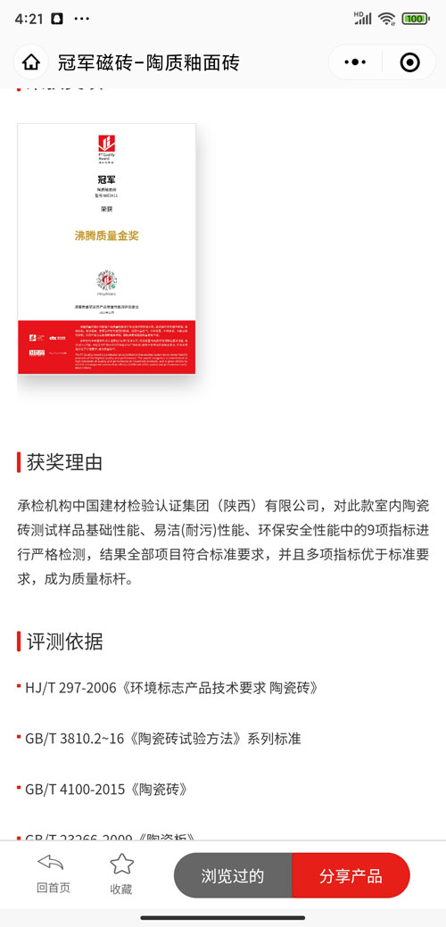 2020年度沸騰質量獎家居產品質量性能測評活動圓滿收官,冠軍磁磚兩項產品陶制釉面磚、瓷質釉面磚榮獲“沸騰質量金獎”榮譽。