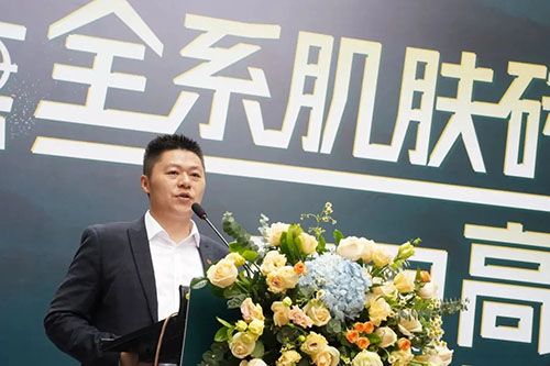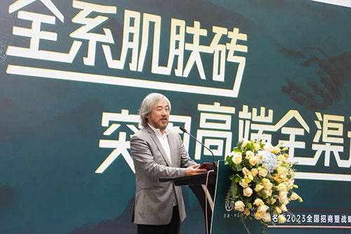 章氏企業董事總經理章云黨在致辭中提到,當前高端消費群體對瓷磚的表面質感及觸感要求越來越高,出于對市場需求的持續引領,金玉名家2022年大膽將品牌升級為“金玉名家肌膚磚”。