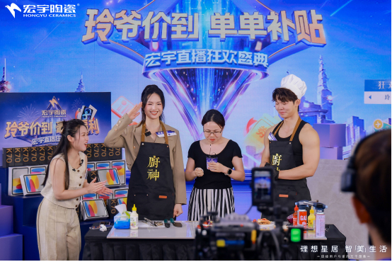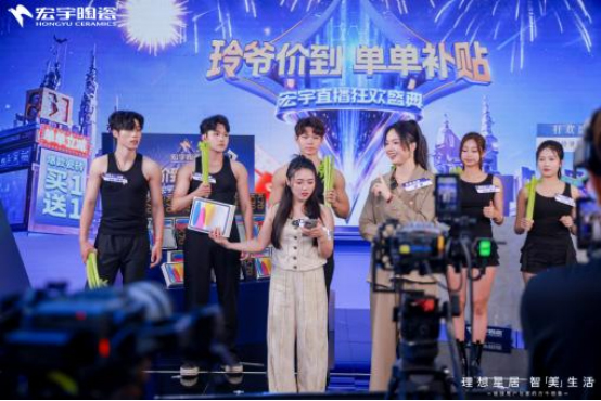 場景創新方面,打造1800㎡全實景超大直播間,全實景直播間模擬了各種真實的家居環境,從溫馨的客廳到時尚的廚房,觀眾可以直觀地看到宏宇陶瓷產品在不同場景下的實際效果,感受產品的質感和美感,精準觸達年輕消費群體。