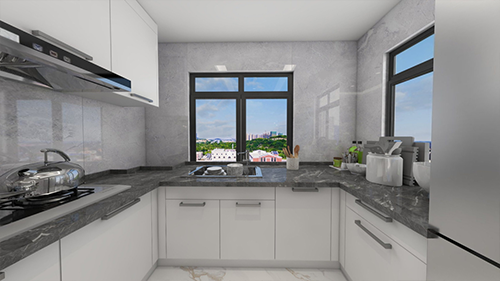(地面使用:DLL918107F 艾爾白) 入戶直入客廳,整體空間以白色為主色調,整潔、干凈是留下的第一印象。地面通鋪900×1800mm規格的艾爾白,動線流暢,紋理逼真,利落簡潔,美感與舒適感并存。 ![]() ![]() (地面使用:DLL918107F 艾爾白) 客廳設置書架和鋼琴,提高整個空間的藝術檔次。大落地窗增強了房間的光線,也讓整體看起來更加大氣。軟裝的選用加重了色彩的碰撞,雅而不俗,生機又不缺乏高級感。 廚房 KITCHEN