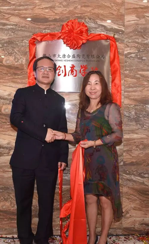 大唐合盛瓷磚董事長兼總經理曾志堅(左)與國促會制造與建筑專業委員會會長金亞范(右)一同為大唐合盛瓷磚文創商學院揭牌!
